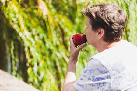 Senior woman eating red apples a healthy snack outdoors - Cute old lady holding and enjoying juicy and tasty fruit while walking in the park on a sunny day