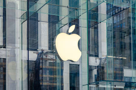 DUSSELDORF, GERMANY - APRIL 14, 2017: Apple sign on the Apple store in Dusseldorf. Apple is an American multinational technology company headquartered in Cupertino, California