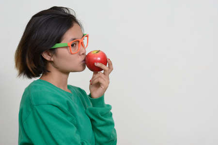 Red apple in female hand isolated on grey wall background. Healthy nutrition diet. Vitamin snack.