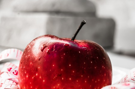 Red apple with measuring tape, weight loss concept monochrome and red