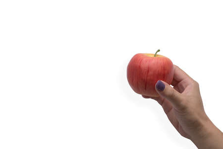 Female hand holding fresh apple isolated on white background with copy space.