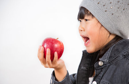 Asian Little girl with fruit and vegetables,concept Healthy food, vitamin and diet in the white background.