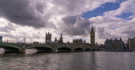 Westminster in London in a cloudy sky. Big Ben of UK, London, horizontal orientation, England, UK.