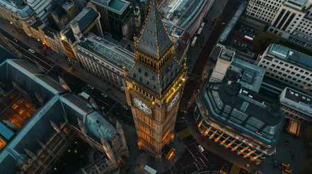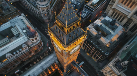 Aerial view of Big Ben at night in London, UK.