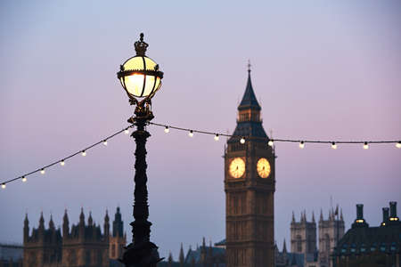 Big Ben Clock Tower at Twilight, London England Festive Illumination and Bokeh Lights