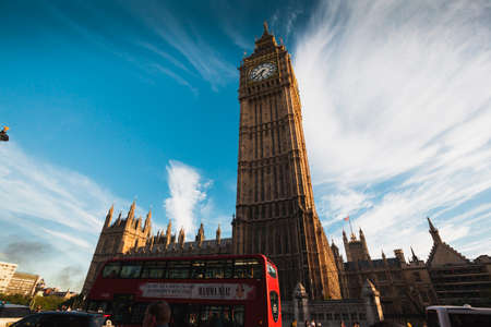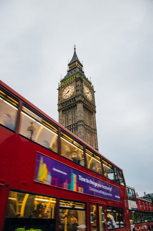 London, UK - August 18, 2015: Low angle view of Big Ben from Westminster Bridge a cloudy day with a moving double decker bus on foreground. Big Ben and red double decker buses are two of the most important symbols of London.