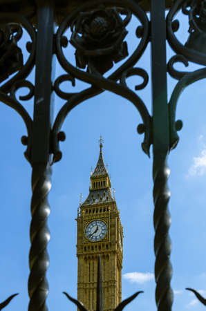 Elizabeth tower with Big Ben, photographed through a metal fence, London