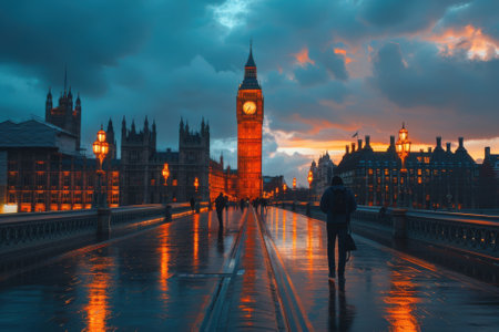 Bustling crowd at dusk by big ben in London, showcasing travel allure and lively urban vibes. A.I.