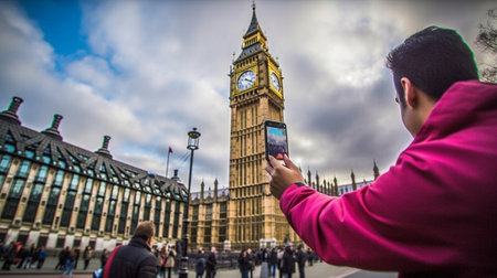 Generative AI : Tourist visiting London England Happy man taking selfie with iconic uk landmark Travel and european vacations concept