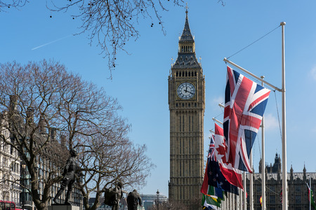 Union Jack fluttering over Big Ben classic London travel and culture scene