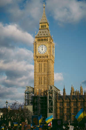 Parliament Square, London | UK - 2022.03.06: Ukrainian people protest, thousands gather to demand tougher sanctions on Russia from British Government, EU and USA to stop the war in Ukraine