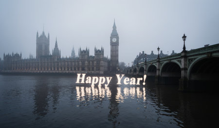 The iconic skyline of London is shrouded in mist as the New Year arrives. Big Ben stands tall beside historical buildings, reflecting in the calm Thames waters, creating a serene atmosphere.