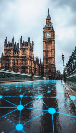 Digital Network Overlaid On Westminster Bridge With Big Ben And Houses Of Parliament, London, UK
