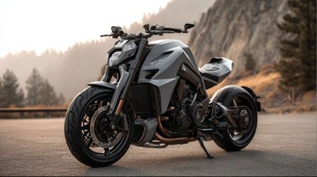 Sleek gray motorcycle parked on winding mountain road with picturesque backdrop
