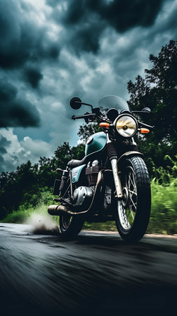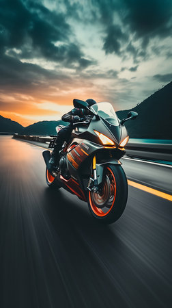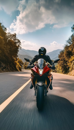 A thrilling dynamic shot of a motorcycle rider speeding along a scenic road. The blurred background creates a sense of motion, emphasizing adventure, freedom, and excitement in a stunning outdoor setting.
