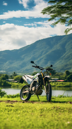Beautiful view of a mountain lake with a motorcycle in the foreground