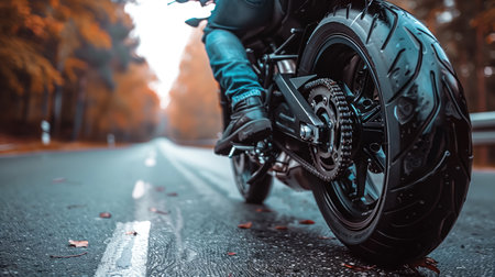 Motorcycle rider on the road in the autumn forest. The concept of extreme sports