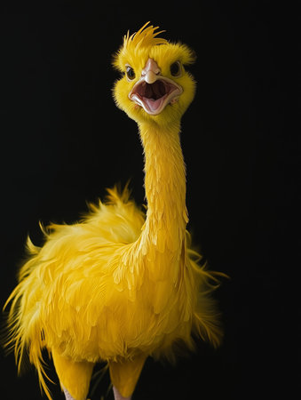 This close-up image features a bright yellow bird, characterized by its fluffy plumage and open beak, set against a dark background.