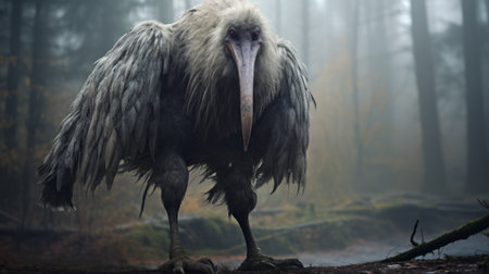 a black vulture, captured in the misty forest, gazes with a haunting eye. this national geographic photo showcases the unique style of the dusseldorf school of photography, with its inventive character designs and soft, dreamy depictions. the image evokes a sense of mystery and intrigue, reminiscent of hyper-realistic oil paintings. ai generated