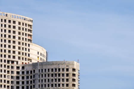 View of a modern complex of unfinished monolithic concrete buildings against the sky. Global urban development concept. Copy space