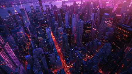 Experience the vibrant energy of a modern city at twilight from above, featuring soaring skyscrapers and illuminated streets showing casing urban life and architecture.