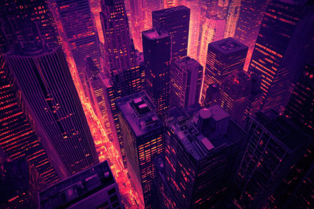 Stunning aerial view of a bustling urban cityscape at dusk, showcasing towering skyscrapers illuminated by city lights. The intricate layout reveals dynamic energy and architectural beauty.