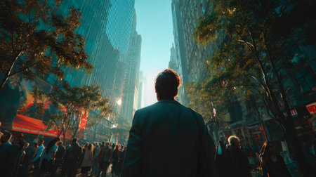 A man in casual attire standing confidently in front of a towering city skyline. The urban landscape consists of skyscrapers, office buildings, and bustling city life below.