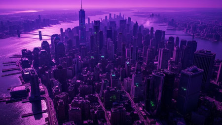 An aerial view of the New York City skyline bathed in a vibrant, futuristic purple light. The towering skyscrapers and urban landscape are illuminated, creating a surreal and dreamlike atmosphere. The city lights glow intensely, reflecting on the water and bridges. captures a modern metropolis with a fantastical, sci-fi aesthetic, offering a unique and visually striking perspective of urban life at night.