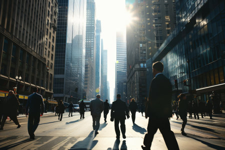 A busy street with skyscrapers and people in business attire. --ar 3:2 Job ID: b5e37eb9-dc8b-4498-a79e-b4c076e58fc8