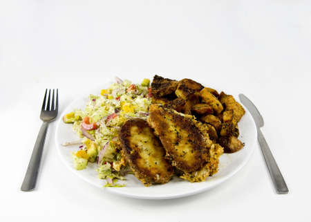 Pork chops baked in cheese with French fries and fresh salad on a plate.