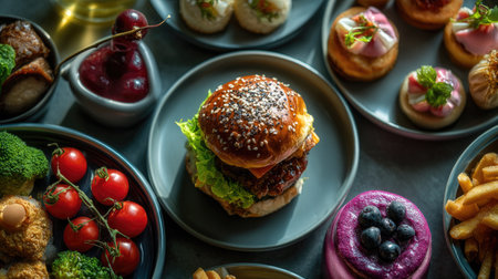 A gourmet burger featuring fresh vegetables rests at the center, surrounded by an enticing array of snacks and desserts, perfect for any gathering.