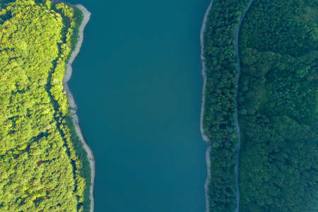 Top down aerial view of big lake with clear blue water between high mountain hills covered with dense evergreen forest.