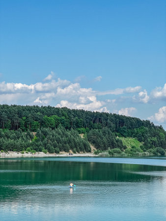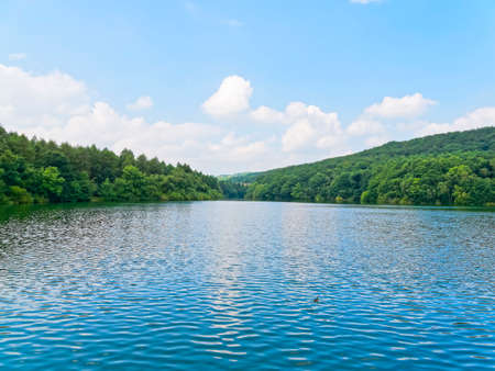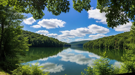 Scenic tranquil lake surrounded by dense forested hillsides calm water surface reflections beautiful nature landscape