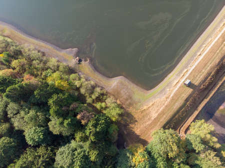 Abstract looking vertical detail view from the corner of a pond in the Harz Mountains, aerial view, taken with the drone.