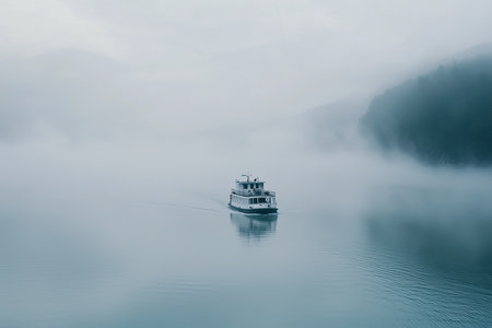 Picturesque scene of a majestic steamboat gracefully navigating through a foggy river landscape. Generative AI