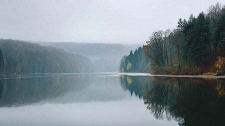 A tranquil autumn landscape featuring a calm lake surrounded by misty hills and vibrant trees. The serene water reflects the soft hues of nature's beauty.