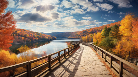 A wide shot of a dam in autumn, surrounded by colorful trees. The sky offers ample copy space for text.