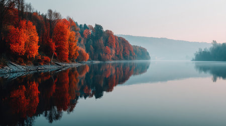 An autumn lake forest reflection calm water morning mist red foliage colorful tree nature landscape tranquil scene peaceful mood seasonal color serene autumn lake with forest reflection and calm