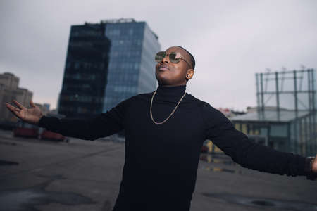 Portrait of handsome fashionable black african man, with afro hairstyle, model in stylish clothes posing outdoors, fashion concept, people