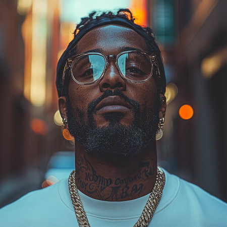 Close-up image of a stylish man wearing glasses, showcasing tattoos and jewelry, with a blurred urban background. Captures modern street style and character in a moody ambiance.