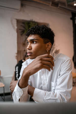 A young black man is sitting at the table with a laptop, drinking tea and using a smartphone. The guy in the cafe. Work outside the office, remote work or study concept.