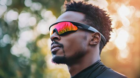 A stylish young man poses outdoors wearing vibrant reflective sunglasses, embodying confidence against a colorful, golden hour backdrop.