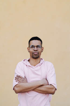 Smiling Afro man portrait wearing pink parka and glasses on pale yellow background