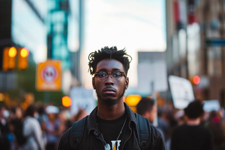 Low angle view of young African man standing in urban area, Oakland, California, United States