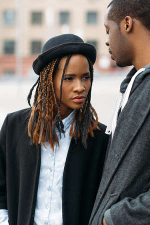 Fashion pedestrian couple. African American youth. Young stylish people, unrecognizable male, beauty concept