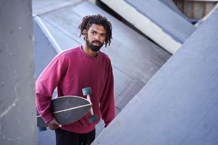 Thoughtful black male outdoors. Cloudy sky. White background with free space, urban style, rainy weather, fashion man model