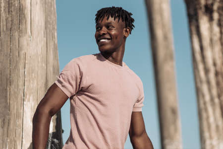 Handsome smiling curly haired african male fashion model, stylish black man smiling outdoors in nature