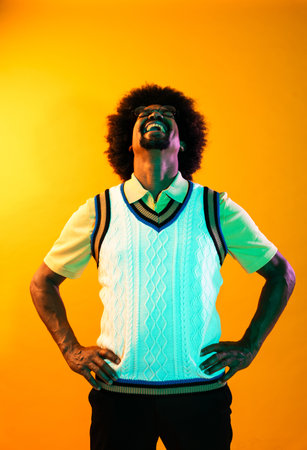 African man portrait in studio on colorful background - Cool black young male with stylish attire posing, creative colored lighting