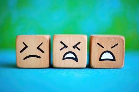 Charming Wooden Cubes with Different Emotions Set Against Soft Blue