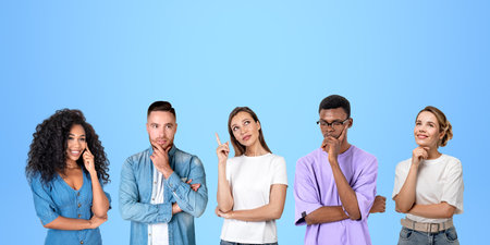 Portrait of five diverse college students in casual clothes standing in row and thinking over blue background. Concept of teamwork, brainstorming, group work and career choice